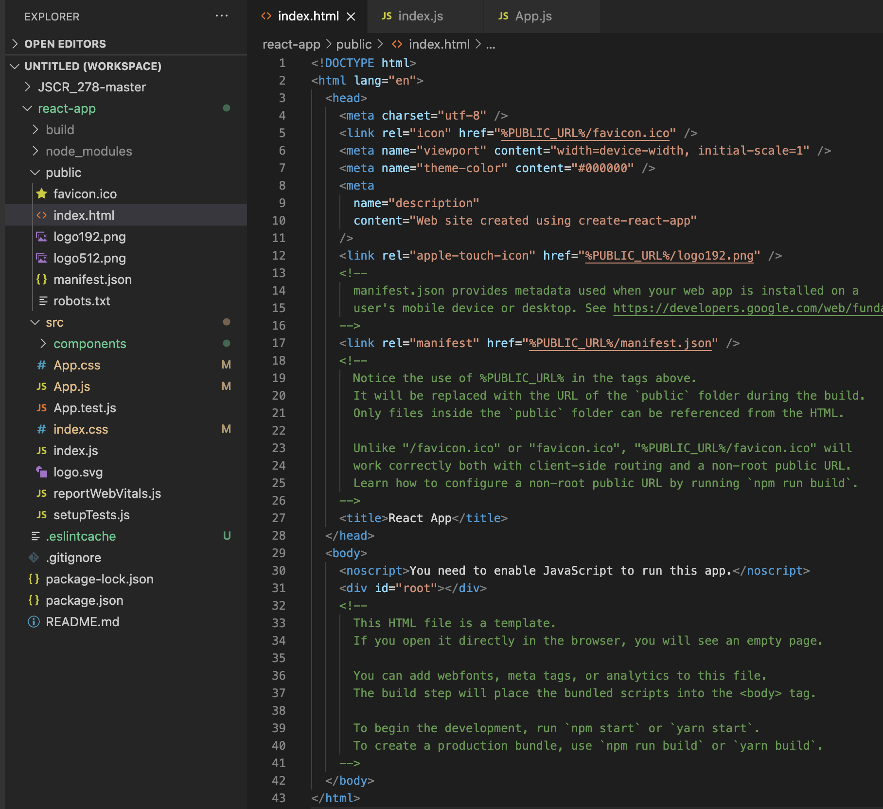 그리고 App은 리액트를 통해 만든 사용자 정의 태그인 Component의 실제구현을 import를 통해 App.js파일을 불러온다.