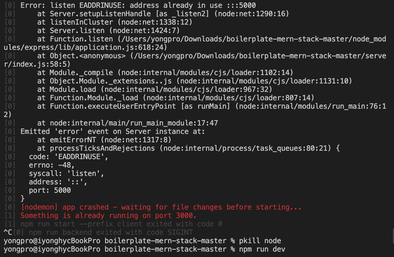npm run dev(리액트 서버와 노드 서버를 한 번에 실행)로 서버를 가동 중일 때 ^C로 서버를 해제하고 난 뒤