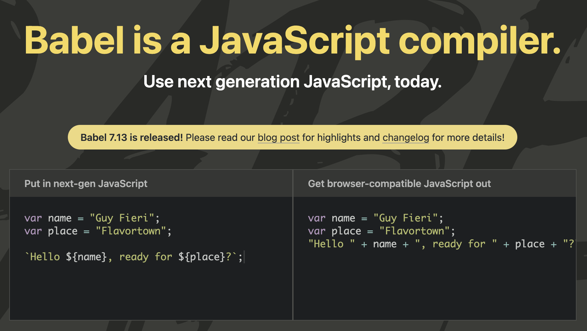 ES6 코드를 ES5 코드로 변환해주는 일에서 리액트의 JSX문법, 타입스크립트, 코드 압축, Proposal 까지 처리해준다.
