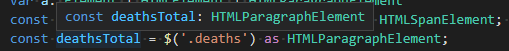 const deathsTotal = $('.deaths') as HTMLParagraphElement;