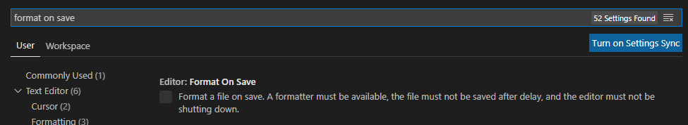 cmd(ctrl) + , 을 눌러 Settings에 들어가 Format On Save에 체크 해제를 시킨다.