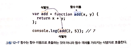 - 함수 선언문에서 살펴본 바와 같이 함수를 호출할 때는 함수 이름이 아니라 함수 객체를 가리키는 식별자를 사용해야 한다. 함수 이름은 함수 몸체 내부에서만 유효한 식별자이므로 함수 이름으로 함수를 호출할 수 없다.