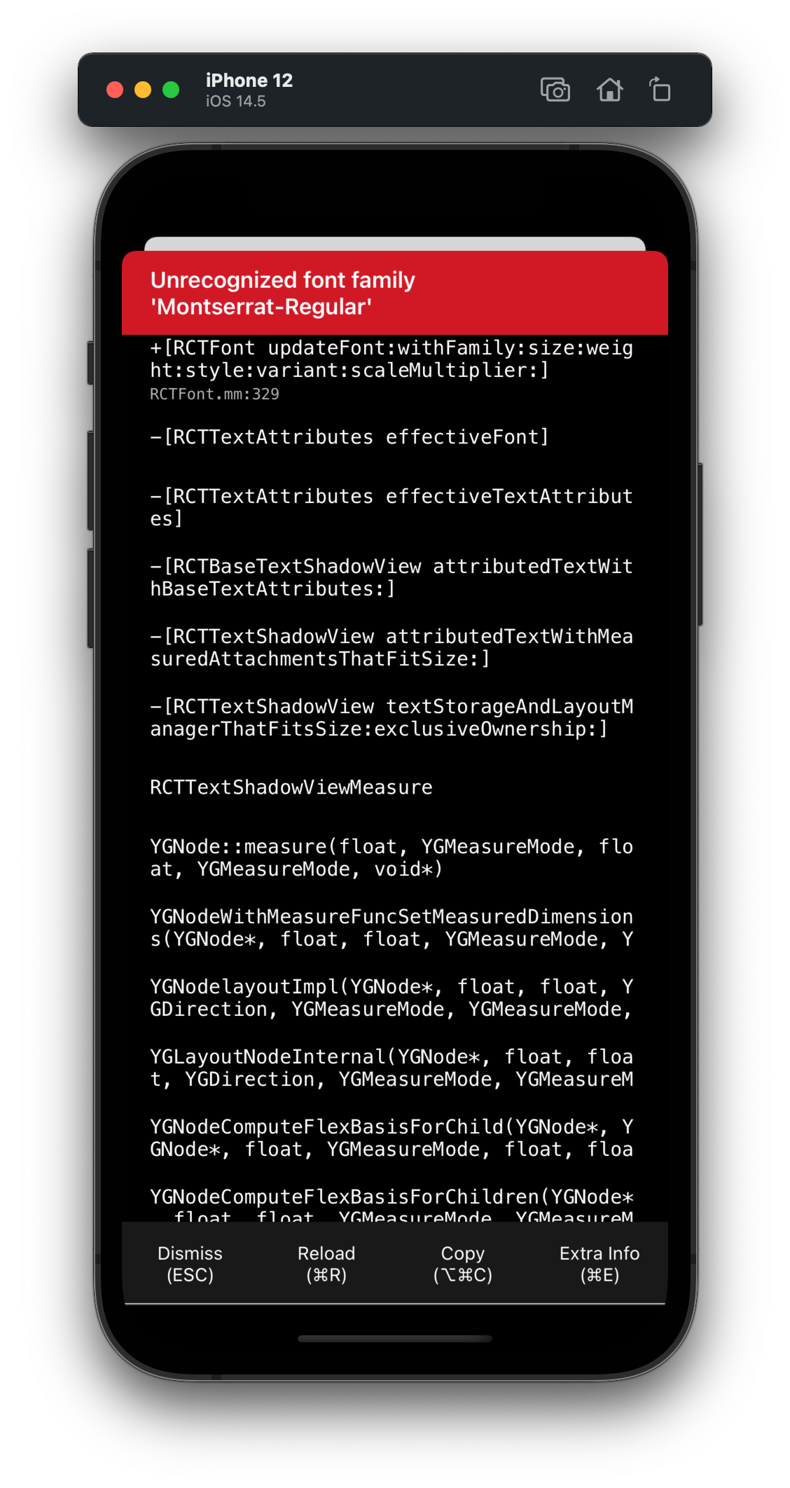 리액트 네이티브 프로젝트 작업 중 커스텀으로 폰트를 적용하였더니 갑자기 아래와 같은 에러메시지가 떴다.
