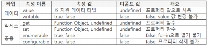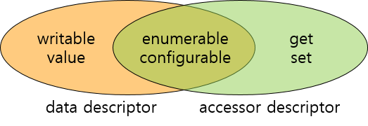 - Enumerable 값이 false인 경우 해당 프로퍼티는 for ... in 문이나 Object.keys 등으로 열거할 수 없고 Writable의 값이 false인 경우 해당 프로퍼티의 value의 값을 변경할 수 없고 Configurable의 값이 false인 경우 해당 프로퍼티를 삭제하거나 재정의할 수 없다.