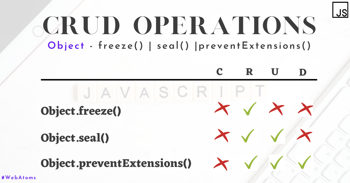 - 자바스크립트는 객체의 변경을 방지하는 다양한 메서드를 제공한다. 객체 변경 방지 메서드들은 객체의 변경을 금지하는 강도가 다르다. 프로퍼티 값 읽기는 모두 가능하며, 프로퍼티 추가는 모두 불가능하다. 프로퍼티 값 쓰기, 프로퍼티 삭제는 아래의 이미지를 참고하자. 프로퍼티 어트리뷰트 재정의는 삭제와 마찬가지로 preventExtensions만 가능하다.