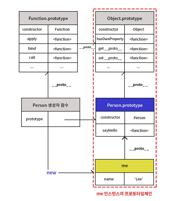 - 프로토타입의 프로토타입은 언제나 Object.prototype이다. 위의 예제에서 Person 생성자 함수에 의해 생성된 me 객체는 Object.prototype의 메서드도 호출할 수 있는데 이것은 me 객체가 Person.prototype뿐만 아니라 Object.prototype도 상속받았다는 것을 의미한다.