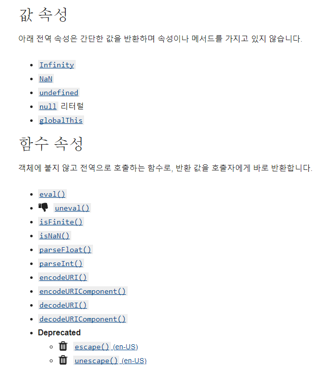 - 빌트인 전역 함수(built-in global function)는 애플리케이션 전역에서 호출할 수 있는 빌트인 함수로서 전역 객체의 메서드다. eval, isNaN, parseFloat, parseInt, encodeURI/decodeURI