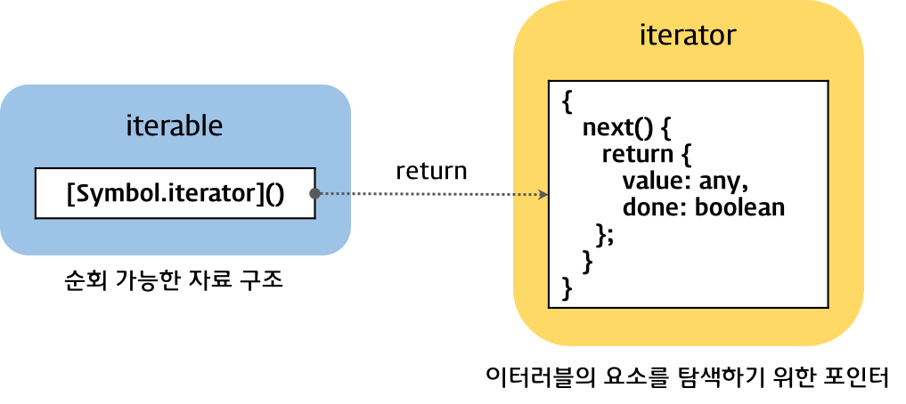 - 이터레이터 프로토콜은 next 메서드를 소유하며 value, done 프로퍼티를 갖는 이터레이터 리절트(iterator result) 객체를 반환한다.