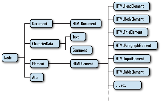- 모든 노드 객체는 Object, EventTarget, Node 인터페이스를 상속받는다. 추가적으로 문서 노드는 Document, HTMLDocument 인터페이스를 상속받고 어트리뷰트 노드는 Attr, 텍스트 노드는 CharacterData 인터페이스를 각각 상속받는다. 요소 노드는 Element 인터페이스를 상속받는다. 또한 요소 노드는 추가적으로 HTMLElement와 태그의 종류별로 세분화된 HTMLHtmlElement, HTMLHeadElement, HTMLBodyElement, HTMLUListElement 등의 인터페이스를 상속받는다.