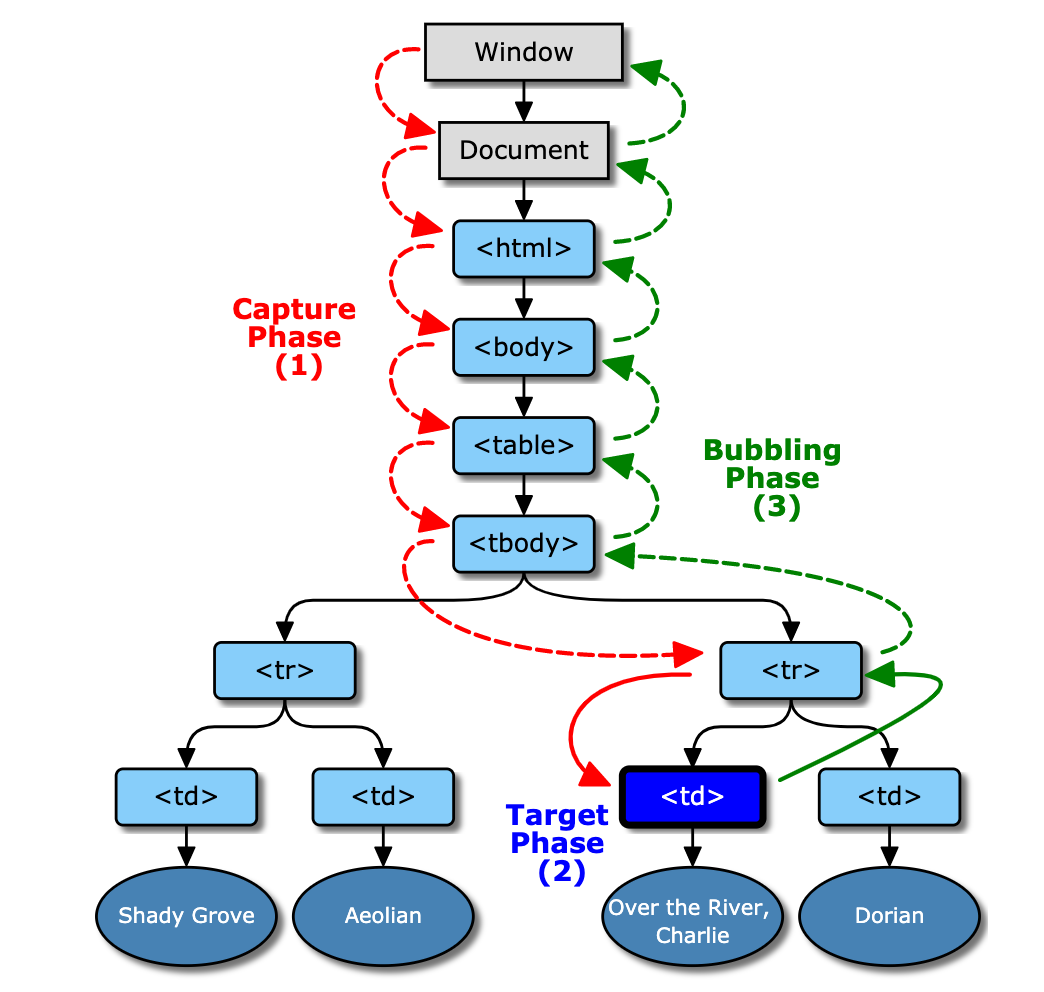- 캡처링 단계: 이벤트가 상위 요소에서 하위 요소 방향으로 전파