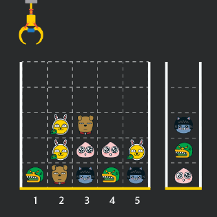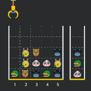 게임 화면은 1 x 1 크기의 칸들로 이루어진 N x N 크기의 정사각 격자이며 위쪽에는 크레인이 있고 오른쪽에는 바구니가 있습니다. (위 그림은 5 x 5 크기의 예시입니다). 각 격자 칸에는 다양한 인형이 들어 있으며 인형이 없는 칸은 빈칸입니다. 모든 인형은 1 x 1 크기의 격자 한 칸을 차지하며 격자의 가장 아래 칸부터 차곡차곡 쌓여 있습니다. 게임 사용자는 크레인을 좌우로 움직여서 멈춘 위치에서 가장 위에 있는 인형을 집어 올릴 수 있습니다. 집어 올린 인형은 바구니에 쌓이게 되는 데, 이때 바구니의 가장 아래 칸부터 인형이 순서대로 쌓이게 됩니다. 다음 그림은 [1번, 5번, 3번] 위치에서 순서대로 인형을 집어 올려 바구니에 담은 모습입니다.
