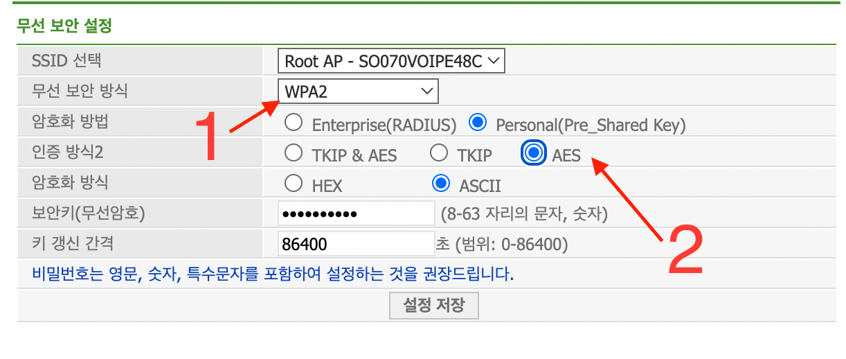 무선 설정 2.4GHz - 무선 보안 설정으로 들어가 위와 같이 WPA2, AES로 변경한 뒤 설정 저장을 해주고 적용을 누르면 끝.