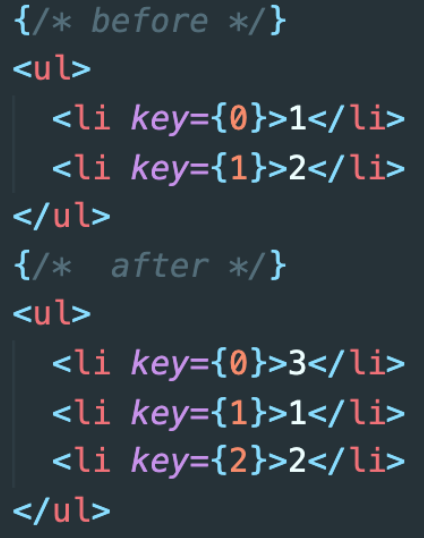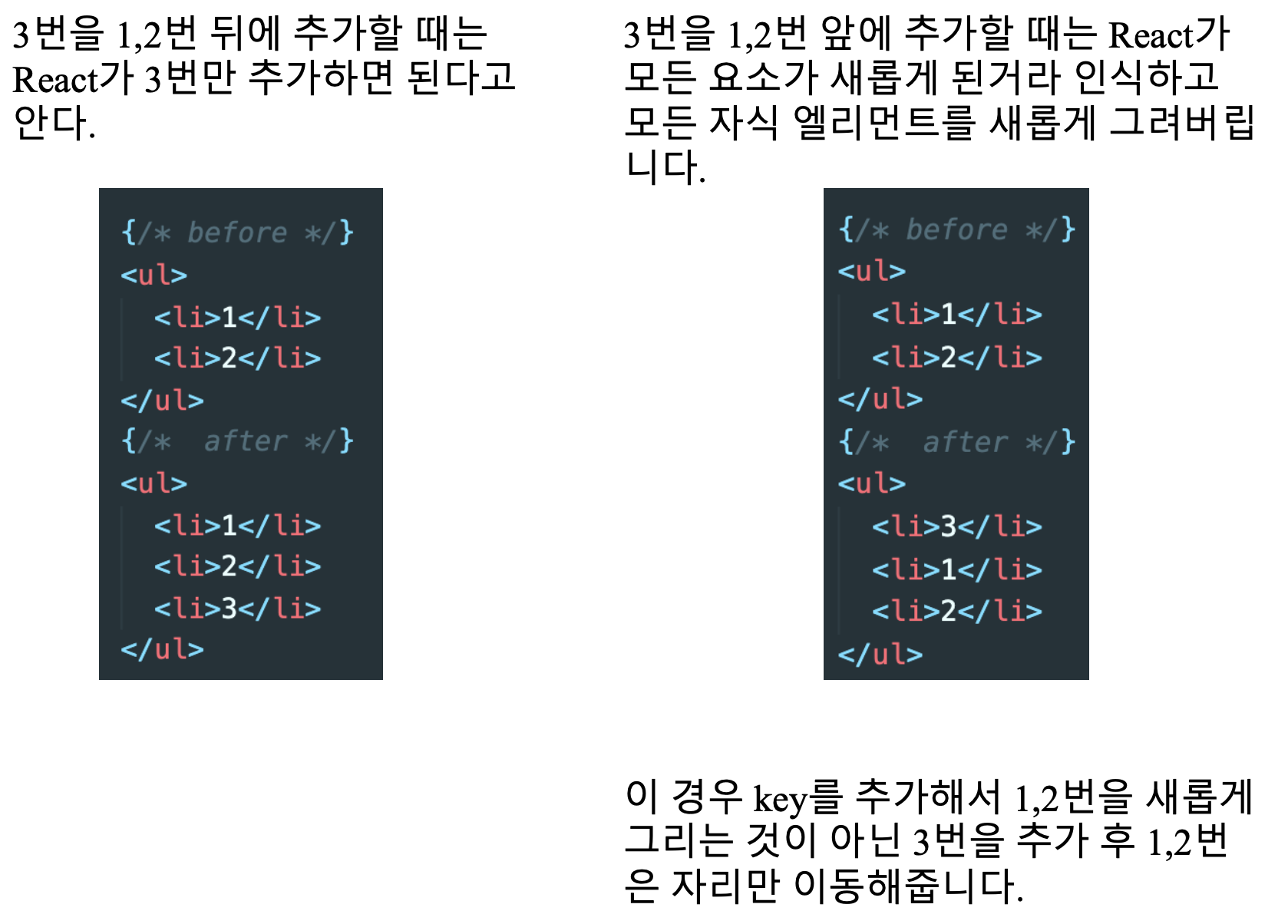 리액트는 가상 돔을 이용해서 바뀐 부분만 실제 돔에 적용하기 때문에 리액트에서 리스트를 나열할 때 바뀐 부분을 찾을 때