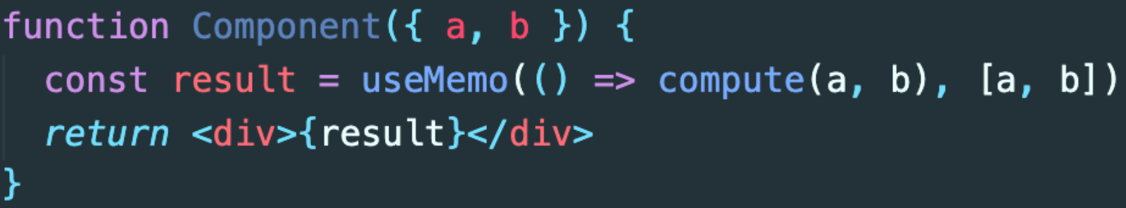compute 함수에 넘겨주는 a, b의 값이 이전과 동일하다면 컴포넌트가 리렌더링 되더라도 연산을 다시 하지않고 이전 렌더링 때 저장해두었던 값을 재활용하게 된다.